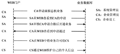 虛擬總機(jī)系統(tǒng)開(kāi)戶流程采用WEB方式實(shí)現(xiàn),以此完成用戶對(duì)虛擬總機(jī)業(yè)務(wù)的定購(gòu)、系統(tǒng)管理員對(duì)用戶開(kāi)戶申請(qǐng)的審核、用戶業(yè)務(wù)參數(shù)的控制等操作,最后企業(yè)員工可以在企業(yè)管理員許可業(yè)務(wù)后,登陸WEB門(mén)戶管理個(gè)人信息。具體流程如圖2所示。