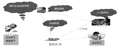步驟五:如果用戶不知道員工分機(jī)號(hào)碼或者希望了解其他信息,主叫用戶可以選擇接入人工秘書(shū)臺(tái)。此時(shí)人工秘書(shū)臺(tái)會(huì)依據(jù)被叫號(hào)碼檢索出被呼叫集團(tuán)的信息,同時(shí)根據(jù)主叫號(hào)碼檢索出主叫用戶是否為企業(yè)內(nèi)部員工或者企業(yè)客戶,同時(shí)將這些信息同步更新到人工秘書(shū)臺(tái)上,話務(wù)員根據(jù)這些信息可以完成作為企業(yè)特色話務(wù)員的服務(wù)工作;