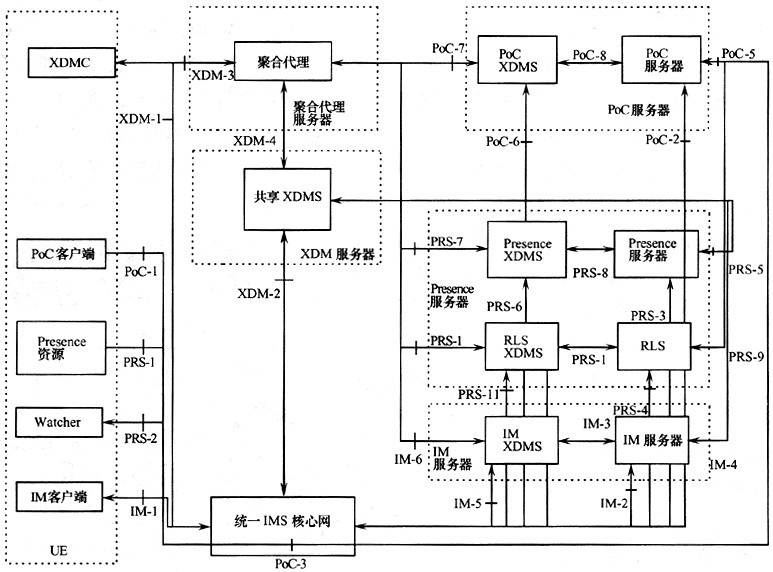OMA雖然定義了XDM、Presence(呈現(xiàn))、Instant Message和PoC等業(yè)務(wù)的功能實(shí)體和參考點(diǎn),但是為了在網(wǎng)絡(luò)中實(shí)現(xiàn)以上業(yè)務(wù),需要將OMA定義的功能實(shí)體和參考點(diǎn)映射成物理實(shí)體和協(xié)議,確定運(yùn)營(yíng)商開(kāi)放此類業(yè)務(wù)對(duì)設(shè)備和協(xié)議的要求,圖2給出了一種映射的方式。XDM服務(wù)器包含的共享XDMS功能提供公共群組的能力,有利于用戶在使用PoC、IM等業(yè)務(wù)時(shí)也能共享此群組。