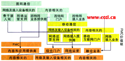 總之,在FMC新配置的價值鏈中,應用和內(nèi)容的作用非常重要,因為他們在融合時將價值鏈中的各個部分連接起來。因此,可以認為內(nèi)容和應用的建立、積累將會推動增值FMC業(yè)務的發(fā)展。今后隨著在內(nèi)容和業(yè)務領域將出現(xiàn)更多不同的參與者,如內(nèi)容提供商、應用提供商和中間件提供商,F(xiàn)MC價值鏈將進一步得到更深層次的合作、擴張和合并。這些在新的價值鏈中出現(xiàn)的更多獨立但又不同的實體,將直接反映FMC融合的特征。