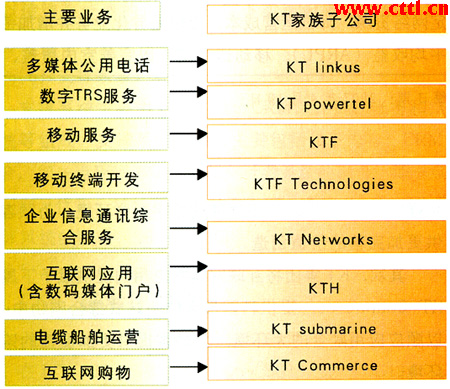 目前,KT集團是全業(yè)務運營商,同時也是韓國最大的固網(wǎng)運營商,它在FMC領域最大動作就是BcN寬帶融合網(wǎng)絡,這是韓國政府為確保韓國在IT和電信技術市場持續(xù)領先地位而實行的IT839計劃的核心環(huán)節(jié)之一。BcN目的是要將有線與無線系統(tǒng)、通信和廣播系統(tǒng)融合在一起,為企業(yè)用戶和個人用戶提供一個共同的渠道收發(fā)語音、文本、圖像和視頻文件。為此,KT集團順著新的價值鏈,對集團內(nèi)部分機構的功能進行了調(diào)整,其主要組織架構如圖2所示:
