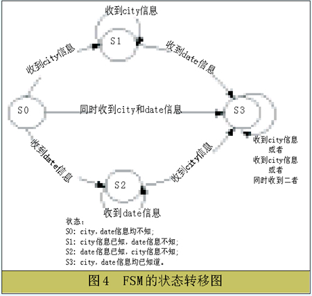 在總結(jié)了前人工作經(jīng)驗(yàn)和結(jié)合本系統(tǒng)的實(shí)際問(wèn)題的基礎(chǔ)上,我們?cè)趯?duì)話管理的具體實(shí)現(xiàn)上,將框架理論和有限狀態(tài)自動(dòng)機(jī)理論相結(jié)合,完成了一個(gè)智能的對(duì)話管理模塊。我們先將對(duì)話管理限制在天氣查詢領(lǐng)域。在系統(tǒng)中,通過(guò)人機(jī)之間的對(duì)話和確認(rèn),系統(tǒng)需要得到要查詢的時(shí)間和地點(diǎn)信息之后反饋查詢結(jié)果。