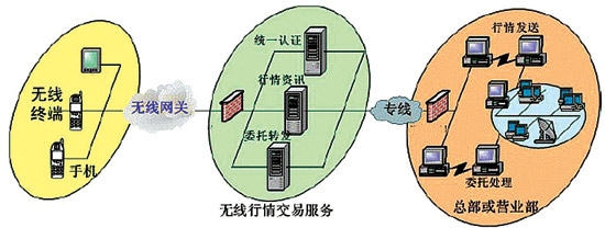 從技術上說,“移動交易廳”主要采用WAP及專用手機客戶端方式,客戶可以通過訪問證券公司專門申請的域名(如廣發(fā)證券公司的http://wap.gf.com.cn),鏈接到證券公司的WAP手機炒股系統(tǒng)服務器,下載手機客戶端軟件,然后通過無線接入網關登錄到移動證券業(yè)務平臺。移動證券業(yè)務平臺的行情及委托交易系統(tǒng)完全利用現(xiàn)有的網上交易系統(tǒng)的資源。
