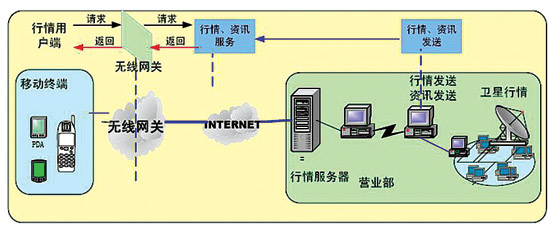 無線終端的請求通過各無線網絡進入移動證券系統(tǒng)的無線接入網關,經無線網關轉發(fā)至移動交易行情服務平臺。如果是讀取行情資訊,行情服務平臺直接提供行情資訊服務;如果是進行委托交易,由委托接入服務器將委托數據轉發(fā)到總部或營業(yè)部,再由總部或營業(yè)部交易處理服務平臺進行處理。換句話說,在無線網關接入后,其后的委托服務、行情服務都可采用現(xiàn)有的網上交易的通道和系統(tǒng)。