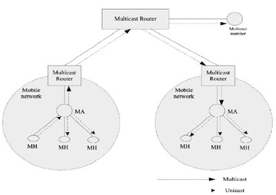 IETF的移動(dòng)IP協(xié)議定義了家鄉(xiāng)代理(home Agent,簡(jiǎn)稱HA)、外地鏈路、外地代理(foreign Agent,簡(jiǎn)稱FA)、通信對(duì)端等概念,一個(gè)移動(dòng)節(jié)點(diǎn)擁有兩個(gè)IP地址:家鄉(xiāng)地址和轉(zhuǎn)交地址。節(jié)點(diǎn)在移動(dòng)過(guò)程中,家鄉(xiāng)地址不改變,發(fā)送到該節(jié)點(diǎn)的數(shù)據(jù)都通過(guò)家鄉(xiāng)地址與轉(zhuǎn)交地址之間的隧道轉(zhuǎn)發(fā)給移動(dòng)節(jié)點(diǎn)。當(dāng)組成員切換時(shí),包括網(wǎng)絡(luò)鏈路間切換的固有時(shí)延,以及重新加入組播組以及建立組播轉(zhuǎn)發(fā)樹(shù)的時(shí)延,都將導(dǎo)致組播成員丟包。