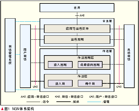 NGN基于IP技術(shù),采用業(yè)務(wù)層和傳送層相互分離、應(yīng)用與業(yè)務(wù)控制相互分離、傳送控制與傳送相互分離的思想,能夠支持現(xiàn)有的各種接入技術(shù),提供話音、數(shù)據(jù)、視頻、流媒體等業(yè)務(wù),并且支持現(xiàn)有移動網(wǎng)絡(luò)上的各種業(yè)務(wù),實現(xiàn)固定網(wǎng)絡(luò)和移動網(wǎng)絡(luò)的融合,此外還能夠根據(jù)用戶的需要,保證用戶業(yè)務(wù)的服務(wù)質(zhì)量。NGN的網(wǎng)絡(luò)體系架構(gòu)如圖1所示,