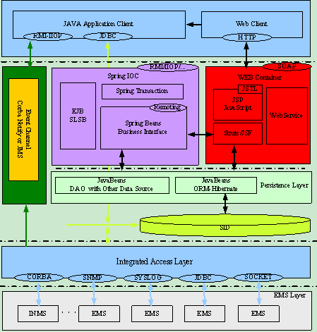 展現(xiàn)層分為兩類用戶界面,一種是Java Application類胖用戶界面;另外一種是純HTTP Web瘦客戶界面。Java Application頁面用于實(shí)現(xiàn)拓?fù)涔芾淼痊F(xiàn)階段不易于采用Web技術(shù)實(shí)現(xiàn)的交互頁面,與其他各層的交互協(xié)議主要采用RMI-IIOP或JDBC。