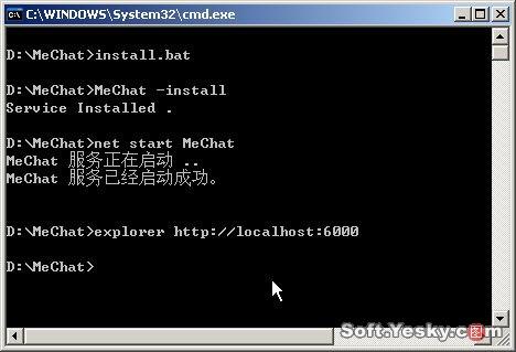 說明:MeChat目錄中還有一個(gè)Run、bat,該文件用于測(cè)試MeChat服務(wù)器。假如安裝MeChat時(shí)Run、bat的命令窗口還開著,則務(wù)必先關(guān)閉此窗口再執(zhí)行install、bat。另外,雙擊執(zhí)行該目錄下的uninstall、bat批處理文件可以停止并刪除系統(tǒng)中的MeChat服務(wù)。
