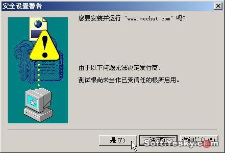 初次進(jìn)入MeChat聊天室,瀏覽器會(huì)彈出如圖25所示的安全設(shè)置警告,單擊“是”,然后程序會(huì)自動(dòng)下載安裝MeChat語音與視頻聊天插件。