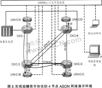 ....圖5顯示了一個用來實現(xiàn)組播信令協(xié)議的4節(jié)點ASON網(wǎng)絡(luò)演示環(huán)境。圖中OXC的核心交換矩陣是基于時分交換,交換粒度為一個SDH