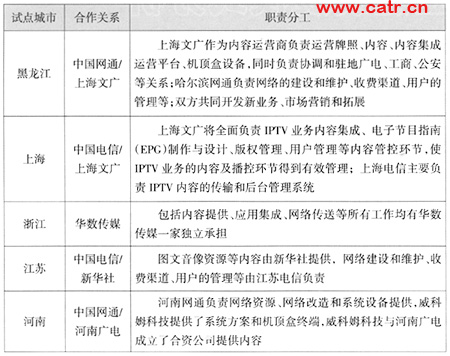 從業(yè)務(wù)參與角度來看,電信行業(yè)方面所開展的業(yè)務(wù)一般都是與其它行業(yè)合作的。表1是典型IPTV試點城市合作方與職責(zé)分工情況。