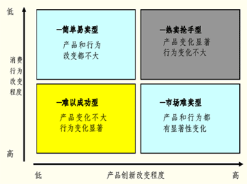 一般來說,產(chǎn)品創(chuàng)新程度越大,取得突破性的成就就越大,但這往往需要消費者改變消費行為和習(xí)慣。消費行為的改變是一個漸進(jìn)的過程。對于企業(yè)來說,開發(fā)一個對客戶有價值的創(chuàng)新產(chǎn)品,要想獲得成功,必須盡量減少消費者行為的改變。我們以消費行為改變程度和產(chǎn)品創(chuàng)新改變程度兩方面進(jìn)行組合得到一個矩陣: