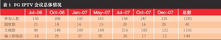 FGIPTV在一年半的時間里共召開了7次會議,收到了1101篇文稿,參加者包括來自40個國家的1243名專家(見表1),其中既包括傳統(tǒng)電信網的專家,也包括來自廣播電視行業(yè)、IT業(yè)的專家,通過這7次會議、提交的文稿以及專家們的貢獻,一方面產生了IPTV的定義,另一方面也形成了21個工作文檔,并根據這些文檔的內容確定了負責此文檔的相應研究組和課題(即Q/SG),詳見表2。