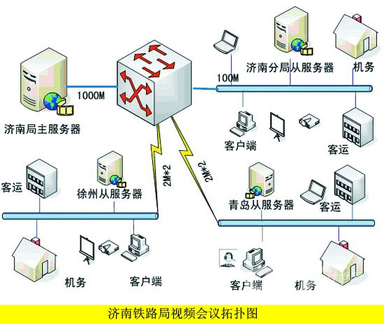 濟(jì)南鐵路局規(guī)模龐大,機(jī)構(gòu)復(fù)雜,由于鐵路的特殊性,一個(gè)部門(mén)或機(jī)構(gòu)往往分布在鐵路沿線的數(shù)十個(gè)站段。因此,溝通和會(huì)議的模式也是多種多樣的,會(huì)議使用單位較多而且頻繁,這就對(duì)網(wǎng)絡(luò)視頻會(huì)議系統(tǒng)提出了很高的要求,即要能滿足當(dāng)?shù)貢?huì)議的要求,又要能夠?qū)崿F(xiàn)跨區(qū)域的會(huì)議。初期系統(tǒng)需求約500會(huì)議節(jié)點(diǎn)同時(shí)在線,并滿足路局及各段站會(huì)議和日常溝通需要,系統(tǒng)要能夠方便擴(kuò)容,在未來(lái)支撐1000甚至更多的會(huì)議節(jié)點(diǎn)同時(shí)在線。