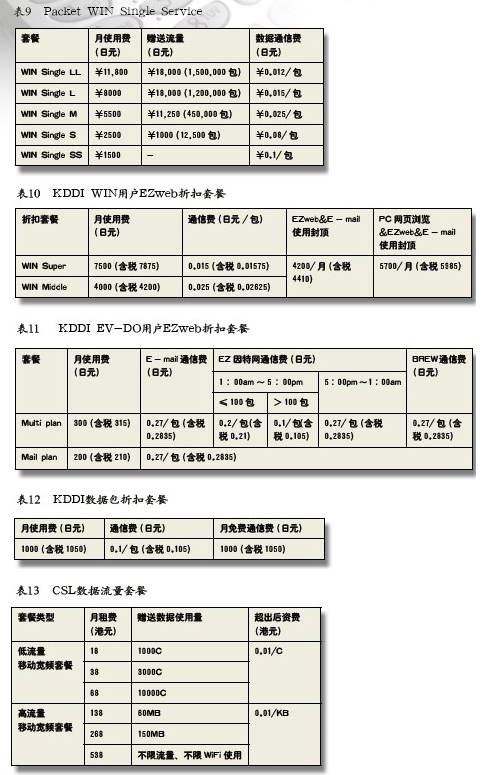 用戶使用WIN au手機(jī),通信包標(biāo)準(zhǔn)計(jì)費(fèi)為0.1日元/包(Packet)(含稅0.105日元),其中1Packe=128Bytes。KDDI為用戶提供分檔包月套餐,見表9。