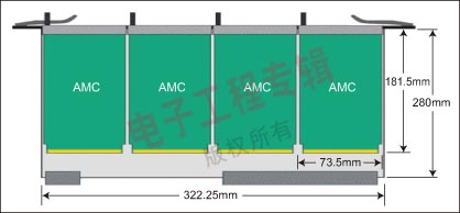 為了提高ATCA設(shè)計(jì)的模塊化性能,PICMG開發(fā)了高級(jí)夾層卡(AMC)規(guī)范。在ATVA卡上放置這些模塊后就可以使它們?cè)L問背板連接,因此這些模塊可以用來定制ATCA卡上的I/O,并用來裝載處理器和存儲(chǔ)外設(shè)。一塊ATCA卡最多能夠放4個(gè)AMC模塊(見圖1),因此設(shè)計(jì)師用一個(gè)卡即可實(shí)現(xiàn)多種不同的配置。就像ATCA卡一樣,AMC模塊同樣可以實(shí)現(xiàn)單個(gè)模塊的遠(yuǎn)程系統(tǒng)管理和熱交換功能。