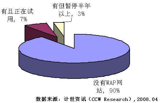 2008年3月至4月,計(jì)世資訊(CCW Research)就企業(yè)WAP網(wǎng)站建設(shè)情況對北京71家企業(yè)進(jìn)行調(diào)研,這些企業(yè)大多分布在互聯(lián)網(wǎng)、IT、電信等行業(yè)。從調(diào)研結(jié)果來看,企業(yè)WAP應(yīng)用還處于初級階段,71家企業(yè)中只有7家擁有自己的WAP網(wǎng)站,其中有兩家企業(yè)的WAP網(wǎng)站已經(jīng)暫停使用超過了半年。接受訪談的71家企業(yè)無一例外的都有自己的WEB網(wǎng)站,與企業(yè)WEB網(wǎng)站相比,企業(yè)WAP網(wǎng)站普及程度還很低。