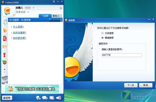 在圖4中,切換到“飛信群”選項(xiàng),單擊“搜索群”按鈕,在彈出的“搜索群”對(duì)話(huà)框中點(diǎn)選“精確搜索”,最后輸入“群號(hào)碼”并單擊“下一步”按鈕(如圖10)。