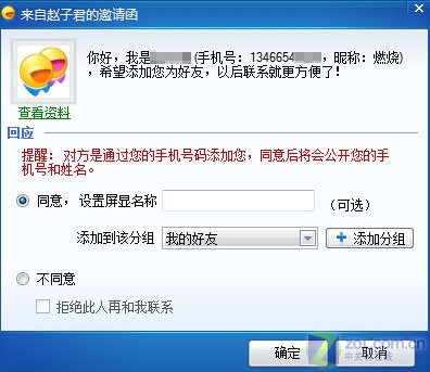 在圖3中,用戶(hù)在確認(rèn)好友發(fā)來(lái)的信息時(shí),為避免好友過(guò)多而忘記對(duì)方的身份,可以直接在上圖中增加類(lèi)似QQ和MSN的“備注信息”,也即“屏顯名稱(chēng)”。
