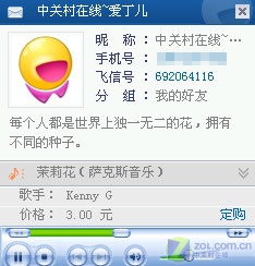 你可以點(diǎn)擊藍(lán)色文字鏈接,在彈出的窗口中單擊左下角的“播放/暫!卑粹o,以實(shí)現(xiàn)在PC機(jī)上聽(tīng)好友彩鈴(如圖5)!這樣的功能其它IM軟件好像沒(méi)有,唯飛信才有的獨(dú)家功能!