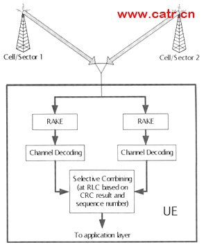 當(dāng)終端用戶移動(dòng)到不同基站下的小區(qū)分界處時(shí)候,采用宏分集技術(shù)同時(shí)接收來自兩個(gè)基站的電視數(shù)據(jù)(見圖3)。在實(shí)現(xiàn)宏分集技術(shù)時(shí),要求網(wǎng)絡(luò)側(cè)針對(duì)同一MBMS業(yè)務(wù)在兩小區(qū)間進(jìn)行內(nèi)容同步和一定程度上的時(shí)間同步。