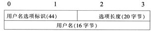 本方案采用DHCPv6協(xié)議作為接入認(rèn)證方式,在DHCPv6 Request消息中添加用戶名和密碼選項(xiàng)來(lái)傳送認(rèn)證信息。用戶名選項(xiàng)格式定義如下: