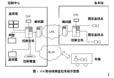 移動(dòng)視頻監(jiān)視系統(tǒng)主要包括前端設(shè)備、后端設(shè)備和傳輸設(shè)備組成。前端設(shè)備主要指圖像攝取設(shè)備(如各種類型的攝像機(jī)),后端設(shè)備主要指圖像顯示、圖像錄制、系統(tǒng)控制等設(shè)備,前后端需要通過傳輸系統(tǒng)連接。為了支持系統(tǒng)的移動(dòng)功能,傳輸環(huán)節(jié)中至少有一部分是無線傳輸系統(tǒng)。APM移動(dòng)視頻監(jiān)控系統(tǒng)的組成如圖1所示。