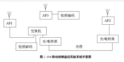 為了保證APM移動(dòng)視頻監(jiān)控系統(tǒng)的整體性能,筆者就APM系統(tǒng)無線網(wǎng)絡(luò)和視頻編碼器的各自性能,進(jìn)行了實(shí)驗(yàn)。本次實(shí)驗(yàn)采用兩個(gè)步驟,即實(shí)驗(yàn)室測試和現(xiàn)場模擬實(shí)驗(yàn)測試,并在實(shí)驗(yàn)室測試的基礎(chǔ)上,對無線網(wǎng)絡(luò)和視頻編碼器間的初步配合進(jìn)行現(xiàn)場實(shí)驗(yàn)測試,F(xiàn)場的實(shí)驗(yàn)系統(tǒng)組成如圖2所示。