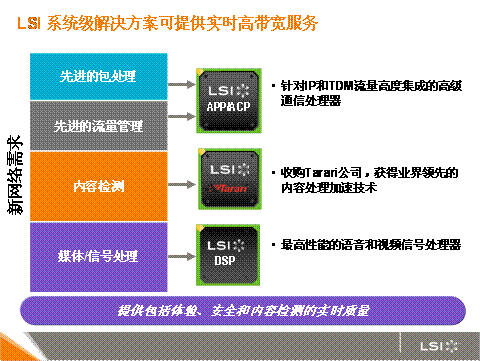 LSI的高級通信處理器可實現(xiàn)出色的服務質(zhì)量、高等級與流量管理能力,對于通過基于數(shù)據(jù)包的網(wǎng)絡交付像實時視頻這樣的新服務與服務而言,這些技術至關重要。由于網(wǎng)絡對高帶寬的需求越來越大,一般的網(wǎng)絡處理器可擴展性跟不上網(wǎng)絡的發(fā)展步伐。然而,LSI 的 NPU 則能將數(shù)據(jù)和控制路徑分開,更加有效地交付媒體流,從而保證了實時可靠性和真正的線速性能。這樣移動用戶可以享受到卓越的視頻質(zhì)量。