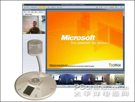 微軟Office RoundTable,音頻-視頻協(xié)作設(shè)備,帶有一個獨(dú)特的 360 度相機(jī)。在結(jié)合 Office Communications Server 2007 使用時,RoundTable 還可交付卓越的會議體驗:將會議環(huán)境擴(kuò)展到多個位置,F(xiàn)場及遠(yuǎn)程位置的與會人員可以全景查看會議室中的每位成員,還可以在輪流發(fā)言時拉近特寫某個與會者。