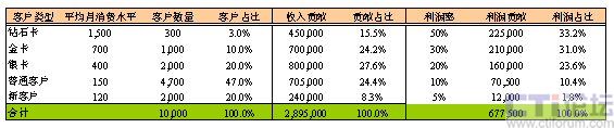 同時(shí),如下表2所示,我們給定了不同客戶分群的客戶平均月消費(fèi)水平及利潤(rùn)貢獻(xiàn)比率。通過(guò)計(jì)算可以得出,高端的鉆石卡客戶雖然僅占客戶數(shù)的3%,貢獻(xiàn)了收入的15.5%,卻貢獻(xiàn)了三分之一的利潤(rùn)。而占近半數(shù)的普通客戶,大約貢獻(xiàn)了收入的四分之一,僅僅貢獻(xiàn)了利潤(rùn)了10%左右。在一些行業(yè)中,服務(wù)和交易成本所占比重較高,普通客戶群甚至有可能會(huì)帶來(lái)負(fù)利潤(rùn)。