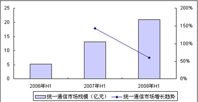 統(tǒng)一通信作為一種以融合技術(shù)為基本特征的特定解決方案和應(yīng)用,通過對各種溝通方式進(jìn)行有效的融合,滿足用戶方便快捷的信息獲取和溝通需求,近年來在全球范圍內(nèi)得到了迅猛發(fā)展,各大通信與信息技術(shù)相關(guān)廠商紛紛加入統(tǒng)一通信市場的競爭中。賽迪顧問數(shù)據(jù)統(tǒng)計(jì)顯示,2008年上半年,中國統(tǒng)一通信整體市場規(guī)模已達(dá)到21.01億元,同比增長超過60.9%,繼續(xù)保持強(qiáng)勁的增長勢頭。