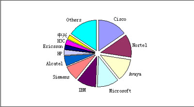 各大通信與IT廠商都在厲兵秣馬,充分挖掘企業(yè)的自身優(yōu)勢,準(zhǔn)備在潛力巨大的統(tǒng)一通信市場中取得良好戰(zhàn)績。賽迪顧問數(shù)據(jù)顯示,2008年上半年,中國統(tǒng)一通信市場中,Cisco公司以15.3%的市場份額繼續(xù)保持領(lǐng)頭樣的位置,在通信設(shè)備領(lǐng)域,Nortel和Avaya分別以12.1%和11.7%的市場份額緊隨其后。值得一提的是Microsoft和IBM以其在全球獨(dú)一無二的終端用戶,迅速占領(lǐng)統(tǒng)一通信軟件市場,無論是市場份額還是整體競爭力都成績不俗,且增長勢頭強(qiáng)勁。各大廠商短時(shí)間的涌入,使得統(tǒng)一通信市場出現(xiàn)了前所未有的群雄逐鹿的局面,競爭異常激烈。