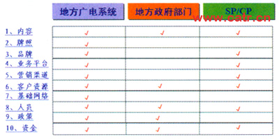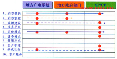 在投資與收益方面,雙方共同出資,成立公司,調(diào)動(dòng)雙方相關(guān)的優(yōu)勢資源。并且協(xié)調(diào)了與SP/CP、政府、行業(yè)部門等多方面原本復(fù)雜的關(guān)系。能夠增加的收入是點(diǎn)播和直播節(jié)目收費(fèi)。收費(fèi)模式方面增加電視包月費(fèi)、頻道組合費(fèi)。合作分成通過股份公司分紅。