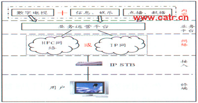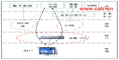 這種模式的合作點(diǎn)主要在接入層面,以提供雙模機(jī)頂盒為主要方法。固網(wǎng)公司和廣電發(fā)揮各自資源優(yōu)勢進(jìn)行合作。廣電節(jié)目傳送由廣電負(fù)責(zé),同網(wǎng)提供寬帶增值服務(wù),兩者分業(yè)經(jīng)營,地位平等。
