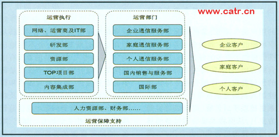 新型的融合產(chǎn)品和服務(wù)突破了原來(lái)的技術(shù)界限,如果還延續(xù)原有的按技術(shù)劃分的部門管理結(jié)構(gòu),必將產(chǎn)生過(guò)多的分支部門,造成企業(yè)結(jié)構(gòu)龐雜、效率低下,對(duì)新的綜合服務(wù)的市場(chǎng)需求缺乏感受力,新服務(wù)無(wú)法及時(shí)推向市場(chǎng)的問(wèn)題。因此,重新進(jìn)行部門劃分,實(shí)現(xiàn)內(nèi)部的協(xié)調(diào)配合是十分必要的。而業(yè)務(wù)提供的融合性、多元化及客戶的統(tǒng)一服務(wù)需求,使這種組織結(jié)構(gòu)的重新構(gòu)建最終將以客戶為中心進(jìn)行構(gòu)建:在前端以客戶為中心劃分運(yùn)營(yíng)部門,實(shí)現(xiàn)對(duì)客戶的直接服務(wù),在后端,以業(yè)務(wù)、運(yùn)維等職責(zé)為中心部署組織結(jié)構(gòu),形成對(duì)運(yùn)營(yíng)執(zhí)行的支撐。