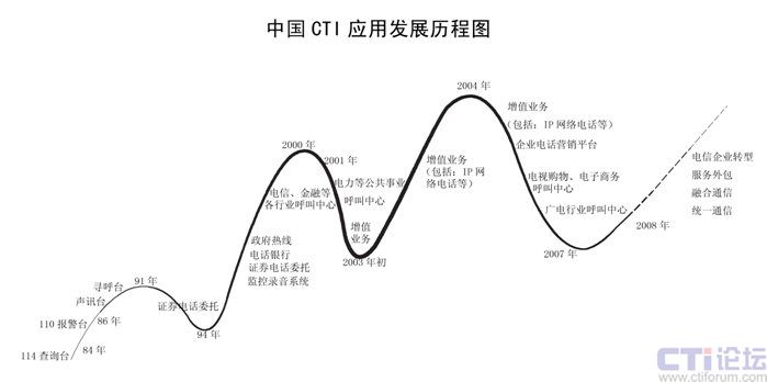 CTI在中國(guó)已經(jīng)發(fā)展了二十多年,已經(jīng)從最早的電信行業(yè)CTI應(yīng)用發(fā)展到金融(包括銀行、保險(xiǎn)、證劵及基金)、電力、郵政、企業(yè)(包括煙草、汽車、家電、IT、互聯(lián)網(wǎng)、旅游、報(bào)業(yè)、航空、物流、醫(yī)療、公共事業(yè)等)、政府、軍隊(duì)等各行各業(yè)的應(yīng)用。特別在1995年到2001時(shí)期,是CTI應(yīng)用發(fā)展最快,普及面最廣的時(shí)期,也是CTI市場(chǎng)進(jìn)入了第二次高潮;從2002開始增值業(yè)務(wù)是整個(gè)CTI行業(yè)的突破口,整個(gè)行業(yè)以增值業(yè)務(wù)為主,CTI市場(chǎng)進(jìn)入了第三次高潮;從2006年開始,增值業(yè)務(wù)進(jìn)入了衰退期,整個(gè)CTI行業(yè)市場(chǎng)出現(xiàn)了嚴(yán)重的危機(jī),加上新的技術(shù)出現(xiàn),技術(shù)的換代,對(duì)原來的傳統(tǒng)語(yǔ)音產(chǎn)品和公司是個(gè)致命的打擊。