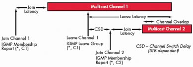 TV節(jié)目通常采用組播方式進(jìn)行傳送。組播是一種允許一個(gè)或多個(gè)發(fā)送者(組播源)一次同時(shí)發(fā)送單一的數(shù)據(jù)包到多個(gè)接收者的網(wǎng)絡(luò)技術(shù)。組播源把數(shù)據(jù)包發(fā)送到特定組播組,而只有屬于該組播組的地址才能接收到數(shù)據(jù)包。在IPTV里,組播源往往僅有一個(gè),即使用戶數(shù)量成倍增長(zhǎng),主干帶寬也不需隨之增加,因?yàn)闊o(wú)論有多少個(gè)目標(biāo)地址,在整個(gè)網(wǎng)絡(luò)的任何一條主干鏈路上只傳送單一視頻流,即所謂“一次發(fā)送,組內(nèi)廣播”。組播提高了數(shù)據(jù)傳送效率,減少了主干網(wǎng)出現(xiàn)擁塞的可能性。對(duì)于TV系統(tǒng)而言,其所能夠支持的用戶數(shù)目?jī)H僅受到接入網(wǎng)絡(luò)能力的限制,與前端推送系統(tǒng)的推送能力無(wú)關(guān)。因此,TV業(yè)務(wù)性能的主要測(cè)試指標(biāo)包括所推送的最大頻道數(shù)目、頻道平均帶寬、平均頻道切換時(shí)間、I幀加入延時(shí)、平均頻道離開延時(shí)、平均頻道加入延時(shí)、頻道重疊時(shí)間和頻道間隔時(shí)間。