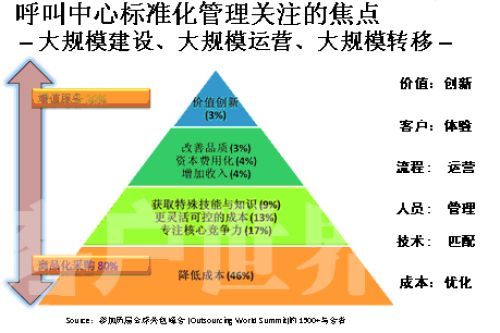 那么,對于這個(gè)尚處在”嬰兒潮”時(shí)期的產(chǎn)業(yè),我們最應(yīng)該做些什么來呵護(hù)和培育這個(gè)產(chǎn)業(yè)健康有序的發(fā)展?大家要好好呵護(hù)這個(gè)行業(yè)。如果只是強(qiáng)調(diào)“要想讓呼叫中心發(fā)展,那就需要我們多投錢,這樣就能買許多機(jī)器,放在公司里面。規(guī)格有了,那呼叫中心就發(fā)展了!蔽矣X得這樣的說法是對呼叫中心發(fā)展的錯(cuò)誤理解。我們這個(gè)標(biāo)準(zhǔn)是希望營建專業(yè)化的產(chǎn)業(yè),整個(gè)呼叫中心產(chǎn)業(yè)的價(jià)值金字塔,這個(gè)金字塔每年在美國有一個(gè)專場,就叫呼叫中心專場,標(biāo)志一個(gè)產(chǎn)業(yè)成熟的金字塔是怎樣的。通過調(diào)查發(fā)現(xiàn),當(dāng)產(chǎn)業(yè)進(jìn)入成熟階段,標(biāo)準(zhǔn)化服務(wù)的第一個(gè)就是降低成本,也就是提高生產(chǎn)效益,能夠把這個(gè)產(chǎn)業(yè)細(xì)化分解,高度的模塊化進(jìn)行精細(xì)控制的時(shí)候,其他的差異化的體現(xiàn)。呼叫中心本身是不是成為企業(yè)核心競爭力的一部分,或者說越來越成熟的外包商出現(xiàn),能夠把一些企業(yè)非核心競爭力加入到自己的核心競爭力之上,這叫專業(yè)化。還有一個(gè)更加靈活可控的成本,呼叫中心的彈性從一百人到一千人,一千人到三千人的發(fā)展更加可控。還有獲得特殊技能與知識(shí),事實(shí)上呼叫中心各行各業(yè)知識(shí)都會(huì)接觸,你只有專著才能做得更好,本身對于呼叫中心的從業(yè)人員來說,在這個(gè)產(chǎn)業(yè)中扮演的角色不是締造一個(gè)企業(yè)的核心競爭力,怎么期望從業(yè)人員掌握更多的技能和知識(shí),來指導(dǎo)更多的行業(yè)和企業(yè)。特別是在客戶導(dǎo)向上面的發(fā)展,還有在金字塔上面增加收入,分析客戶所需,讓我們更好的滿足客戶的需求;然后資本費(fèi)用化,從外包專業(yè)化領(lǐng)域帶來的變化,很多的時(shí)候最大的一筆建設(shè)是呼叫中心,基本一個(gè)中等的呼叫中心沒有500萬以上的資金投入是不可想象的。