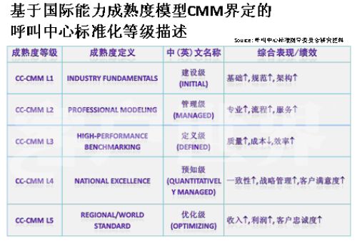Markets)呼叫中心產(chǎn)業(yè)深入研究相結(jié)合的成果。。我在前幾年企業(yè)實(shí)施標(biāo)準(zhǔn)的時(shí)候深入研究了這套模型,這套模型對我們呼叫中心產(chǎn)業(yè)有極大的適用性,幾乎每個(gè)呼叫中心都可以在這套模型找到定位,從一個(gè)渾沌的初始過程到管理者,如果能夠建設(shè)一個(gè)持續(xù)的管控的流程到定義級,如何進(jìn)行一致化管理,再到預(yù)知級,幾乎每個(gè)呼叫中心從大到小,從年輕到發(fā)展一段時(shí)間都可以找到自己的定位,所以我們在原來的信息產(chǎn)業(yè)指導(dǎo)委員會(huì)的支持下,我們重新結(jié)合CMM模型開發(fā)出了符合我們呼叫中心發(fā)展的一個(gè)標(biāo)準(zhǔn),我建議大家把它看成是一個(gè)模型,整個(gè)國際產(chǎn)業(yè)都定性了標(biāo)準(zhǔn),因?yàn)榇蠹叶贾繡MM模型是一個(gè)開放性的知識(shí)體系,并不是一個(gè)封閉標(biāo)準(zhǔn)。CMM模型,首先你的呼叫中心建設(shè)要能夠符合呼叫中心的定義,不是找?guī)着_(tái)話機(jī)或?qū)ν庥袀(gè)一個(gè)客服號碼對外就能稱為呼叫中心。