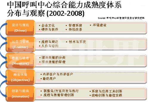 在過去幾年我們也做了很多研究,一個(gè)呼叫中心整合持續(xù)建設(shè)在哪些方面應(yīng)該做定義;旧衔覀兪欠譃槲鍌(gè)方面,在每一級的成熟度方面,我們的呼叫中心都關(guān)注自己的成熟度。1、設(shè)計(jì)與規(guī)范;2、運(yùn)營管理;3、數(shù)據(jù)與績效;4、顧客體驗(yàn);5、創(chuàng)新與提高。第五方面創(chuàng)新與提高在CMM模型中是特有的,它在整個(gè)產(chǎn)業(yè)的發(fā)展過程中,提供戰(zhàn)略革新和戰(zhàn)略工具一體化使用的指導(dǎo)框架和最佳實(shí)踐。