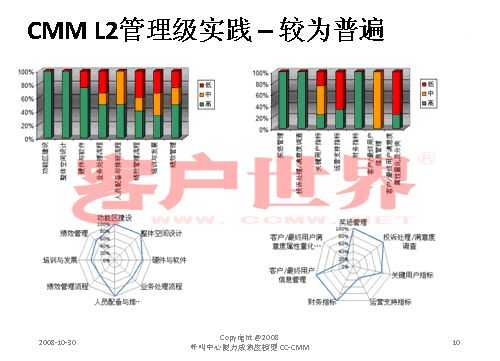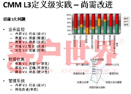 接下來我用一個(gè)很小的案例結(jié)束今天的分享,我們整個(gè)的呼叫中心的成熟度模型目前是在電信行業(yè)開始了2008年版的推廣,成熟度模型經(jīng)歷從07年成立亞太呼叫中心產(chǎn)業(yè)聯(lián)盟以后,由一群這個(gè)行業(yè)里面的專家,特別是中國產(chǎn)業(yè)市場的發(fā)展建立起的標(biāo)準(zhǔn),一年以來在通信行業(yè)我們做的能力成熟度的判定有一些很有意思的啟示,通信行業(yè)占到我們整個(gè)呼叫中心產(chǎn)業(yè)約70%的坐席,是最大的、最有代表性的產(chǎn)業(yè)。做下來真的很有代表性,普遍性在于環(huán)境建設(shè)、資產(chǎn)投入、資產(chǎn)配置,所以這下面的雷達(dá)就可以看到,相對完善都是在環(huán)境建設(shè),功能區(qū)建設(shè),整體空間設(shè)計(jì)、硬件相對來說比較偏硬的一些。在其他方面偏廢的比較厲害。第二個(gè)雷達(dá)在一些獎(jiǎng)懲管理、信息管理,整個(gè)軟性方面幾乎有很濃重的一些計(jì)劃經(jīng)濟(jì),制造行業(yè)的一些領(lǐng)域相對來說比較成熟。我們目前看到的,基本上通信行業(yè)的一些發(fā)展在能力成熟度上是二級到四級,尤其以二到三級的發(fā)展更為普遍。通常的方法為期一周的標(biāo)桿調(diào)研,看所有的呼叫中心發(fā)展的五個(gè)方面,我們才會(huì)在里面做這樣的判定。在能力成熟度的三級,我們做了一些企業(yè)發(fā)現(xiàn),特別在三級,關(guān)于能不能對流程進(jìn)行一致性管理方面,就是剛才李老師講到的不是最急的,而管理是最重要的?赡芩械牧鞒潭喽嗌偕儆幸恍┏墒於鹊膯栴},但是我們的源頭流程能力在三個(gè)方面有很大的差距:一個(gè)是業(yè)務(wù)監(jiān)控流程,第二個(gè)數(shù)據(jù)收集流程,還有一個(gè)是管理系統(tǒng)的審核流程。這個(gè)大家可以和自己的呼叫中心比一比。