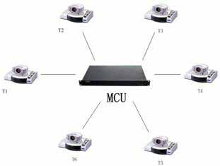 在會議場點數(shù)目不多且地域分布比較集中時,可采用單MCU方式,其組網(wǎng)結(jié)構(gòu)見圖所示。圖中T1-T6均為視頻會議終端系統(tǒng)設(shè)備。