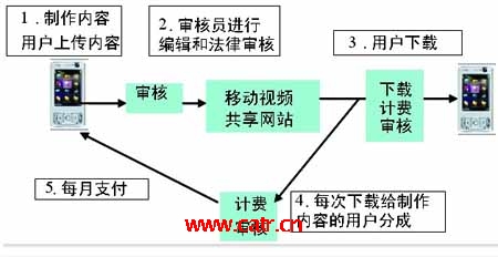 由于UGC(用戶產(chǎn)生內容)類業(yè)務的產(chǎn)生,內容類業(yè)務出現(xiàn)了創(chuàng)新的商業(yè)模式,根據(jù)內容下載情況與內容提供者之間進行分成。和黃3公司就推出了這樣的盈利模式,我國移動視頻共享網(wǎng)站也在向這個方向探索。