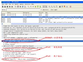 以上是一個用戶開機的信令過程,在BSSMAP消息層中,可以獲取CGI=0X0457-2222;在DTAP消息層中,可以獲得獲得本次消息類型為LocationUpdatingREQ,同時用戶標(biāo)識為TMSI=0X8c000093,通過對對之前或之后(簽權(quán)、IDREQ/RSP)等信令的關(guān)聯(lián),可以獲得用戶IMSI、MSISDN和CGI的對應(yīng)關(guān)系。其它信令過程,如周期性位置更新、短信收發(fā)、主被叫等,和以上分析過程類似。