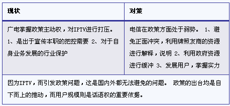 IPTV目前遇到的廣電阻力,主要源于和廣電有線網(wǎng)絡(luò)公司所推進的數(shù)字電視的業(yè)務(wù)競爭,而有線網(wǎng)絡(luò)通過和廣電局的關(guān)聯(lián)關(guān)系,引發(fā)IPTV政策干擾和內(nèi)容屏蔽。