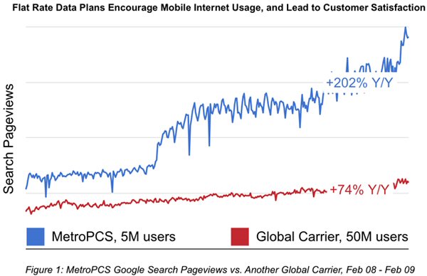 這里以美國(guó)一家地區(qū)性的小運(yùn)營(yíng)商MetroPCS為例,MetroPCS的CDMA用戶(hù)數(shù)剛超過(guò)500萬(wàn)。在過(guò)去的一年里,MetroPCS的Google搜索量增長(zhǎng)了2.5倍。而這個(gè)數(shù)字,是那些全球性的、擁有大量用戶(hù)和3G網(wǎng)絡(luò)運(yùn)營(yíng)商的10倍。