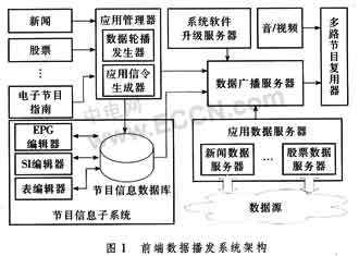 如圖1所示,前端數(shù)據(jù)播發(fā)系統(tǒng)主要包括應用管理器,節(jié)目信息子系統(tǒng),數(shù)據(jù)廣播服務器,系統(tǒng)軟件升級服務器和應用數(shù)據(jù)服務器等5個部分。