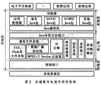 系統(tǒng)層為上層具體應用的執(zhí)行提供基于Java的運行環(huán)境。這層主要包括3部分:Java虛擬機、應用管理器和符合中間件標準的應用編程接口(API)集。Java虛擬機負責解釋和執(zhí)行。lavaTM語言。應用管理器負責管理應用的生命周期。API集除了包括與MHP兼容的部分包,比如基本的Java包,DAVIC包外,還對國家中間件標準作了部分的擴展。