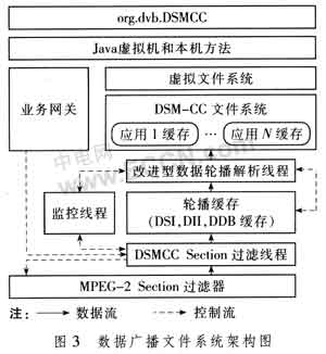 中間件的數(shù)據(jù)廣播文件系統(tǒng)主要負責裝載廣播應用,是數(shù)據(jù)輪播協(xié)議在終端實現(xiàn)的核心模塊。圖3給出了基于改進型數(shù)據(jù)輪播方案的數(shù)據(jù)廣播文件系統(tǒng)的架構(gòu)圖。相關Java功能在org.dvb.DSMCC包實現(xiàn),對應中間件架構(gòu)的系統(tǒng)層部分。具體的功能實現(xiàn)位于核心層。